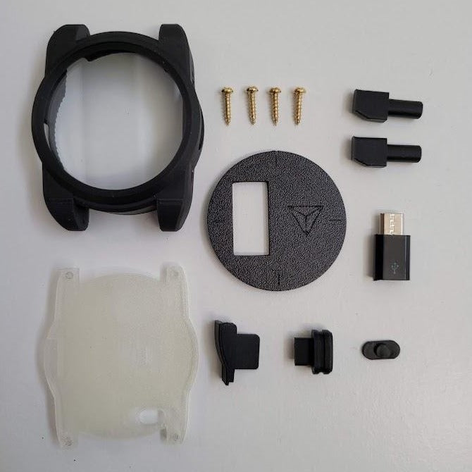 - Watch Body with glass, Back Plate, UNPAINTED Screen Cover, 2 Buttons, USB C Adapter, USB C cap, DIM card cap